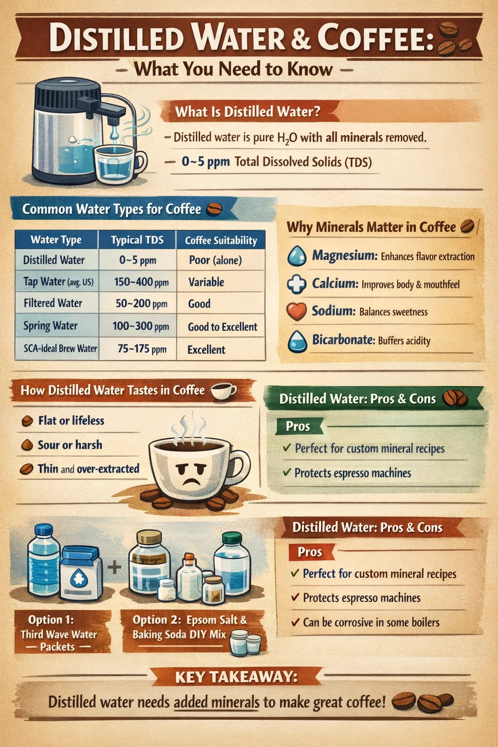 Ano, můžete si připravit kávu s destilovanou vodou – ale pravděpodobně byste se neměli spoléhat výhradně na ni. Destilovaná voda je 100% čistá H2O s odstraněnými všemi minerály , což zní ideálně pro čistý šálek, ale extrakce kávy ve skutečnosti závisí na minerálech, jako je hořčík a vápník, aby vytáhly aromatické sloučeniny ze sedliny. Bez nich může vaše káva chutnat plochá, kyselá nebo dutá – technicky uvařená, ale něco jí chybí. To znamená, že destilovaná voda má své místo, zejména když je smíchána s vodou bohatou na minerály nebo když experimentujete s úplnou kontrolou nad chemií vaření.