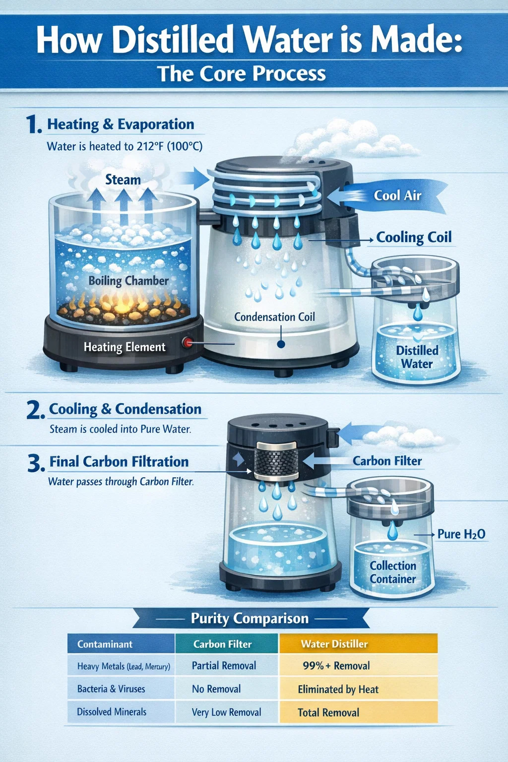 Proces začíná, když varná komora vodní destilátor je naplněna vodou z vodovodu. Elektrický topný článek na základně zvyšuje teplotu na 212 °F (100 °C) . Jakmile voda dosáhne bodu varu, přemění se na páru. Těkavé plyny mohou být uvolňovány ventilací, zatímco netěkavé kontaminanty jako olovo, arsen a fluor zůstávají zachyceny ve varné nádrži.