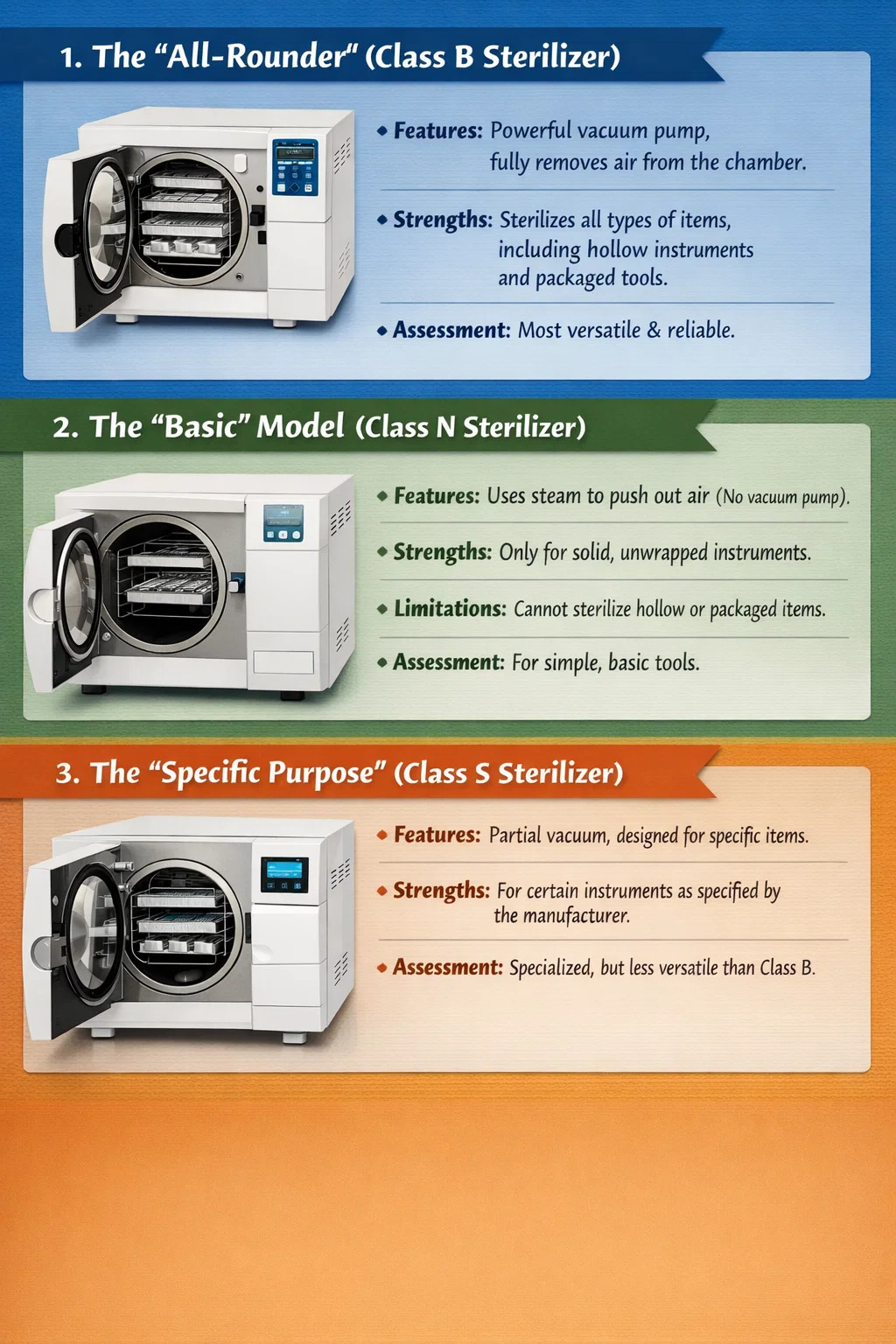 Ačkoli sterilizační zařízení používané v zubních klinikách může vypadat podobně, tyto zubní autoklávy jsou obvykle rozděleny do tří hlavních kategorií podle toho, jak zacházejí se vzduchem a jejich schopností.