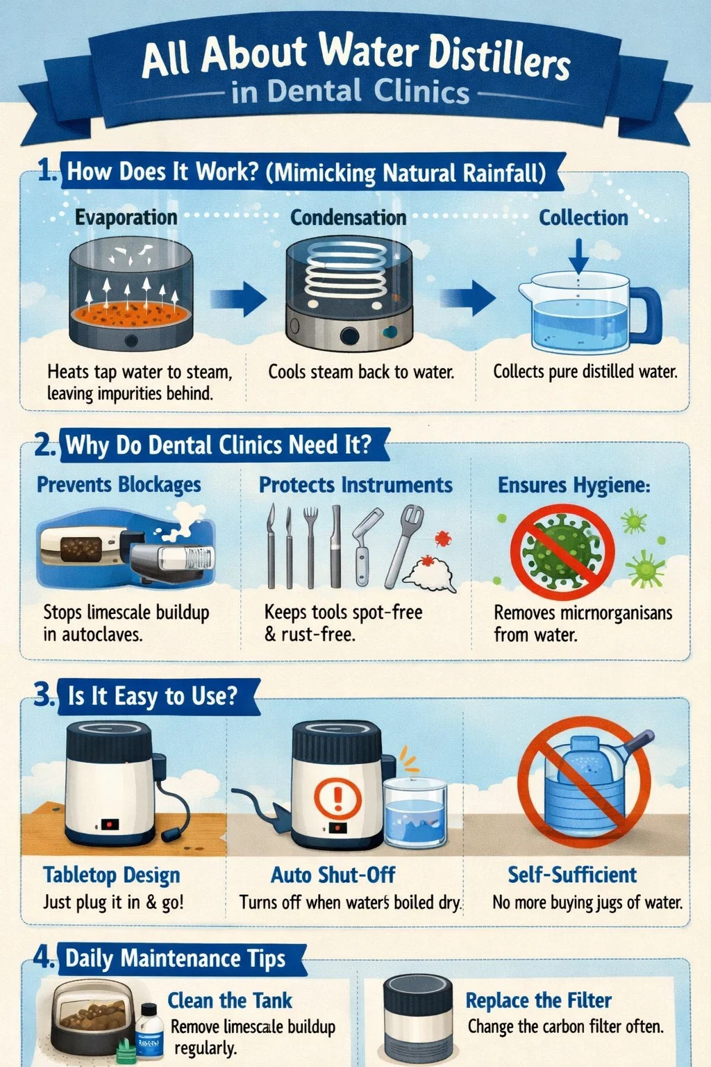 A vodní destilátor je v podstatě malá továrna, která se věnuje výrobě „čisté vody“. V zubních klinikách je to obvykle nejlepší partner pro zubní autoklávy, protože autoklávy jsou velmi "vybíravé" na vodu, kterou používají a mohou používat pouze tuto čistou destilovanou vodu.