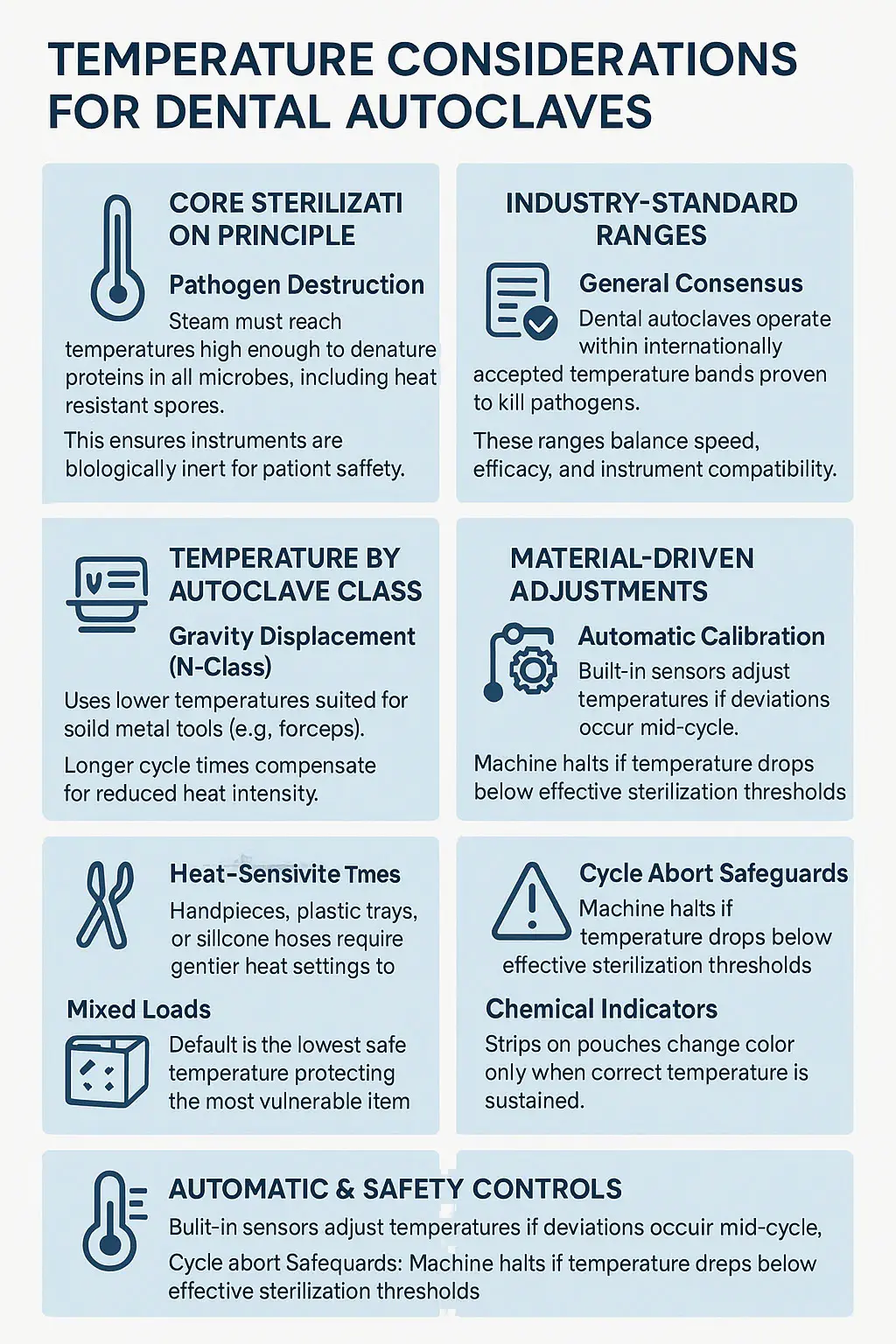 Zubní autoklávy pracují v mezinárodně uznávaných teplotních pásmech, u kterých bylo prokázáno, že zabíjejí patogeny.