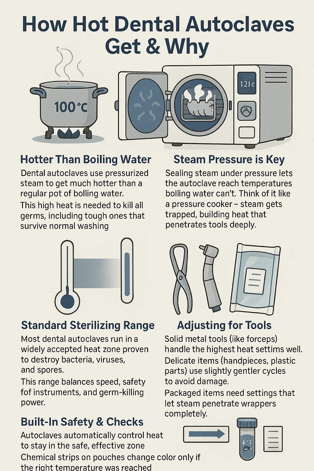 Zubařské autoklávy používají tlakovou páru, aby byly mnohem teplejší než běžný hrnec s vařící vodou.