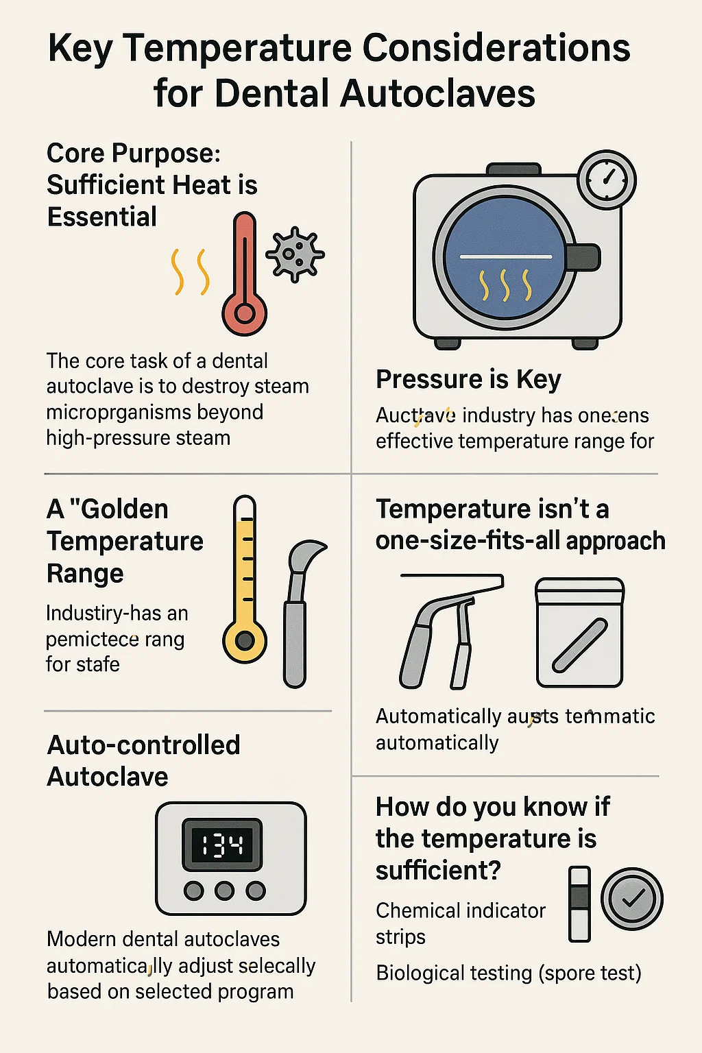 Díky dlouhodobé praxi stomatologický průmysl identifikoval všeobecně uznávaný a účinný teplotní rozsah pro sterilizaci.